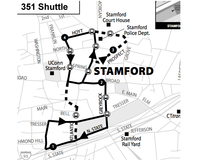 Route 351 provides service between the Stamford Railroad Station and Stamford's central business district on weekdays during the morning and afternoon rush hours. Buses are timed to meet certain CTrail New Haven Line (Metro-North), CTrail Shore Line East and Amtrak Northeast Regional & Acela Express trains at the station. All destinations served by Route 351 are also served by other Stamford local bus routes.